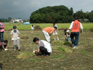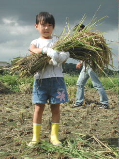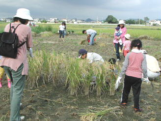 ★子供たちにとっては初めての稲刈り、鎌を持つのも稲穂をつかむのも初体験でした。