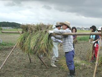 みんなで一生懸命稲刈りをして、掛け干しにしました。